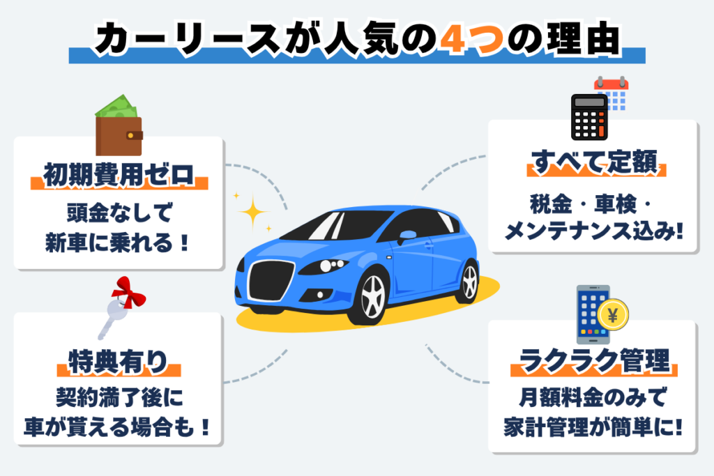 カーリースが人気を集めている理由は、初期費用を抑えて新車に乗れるという手軽さにあります。